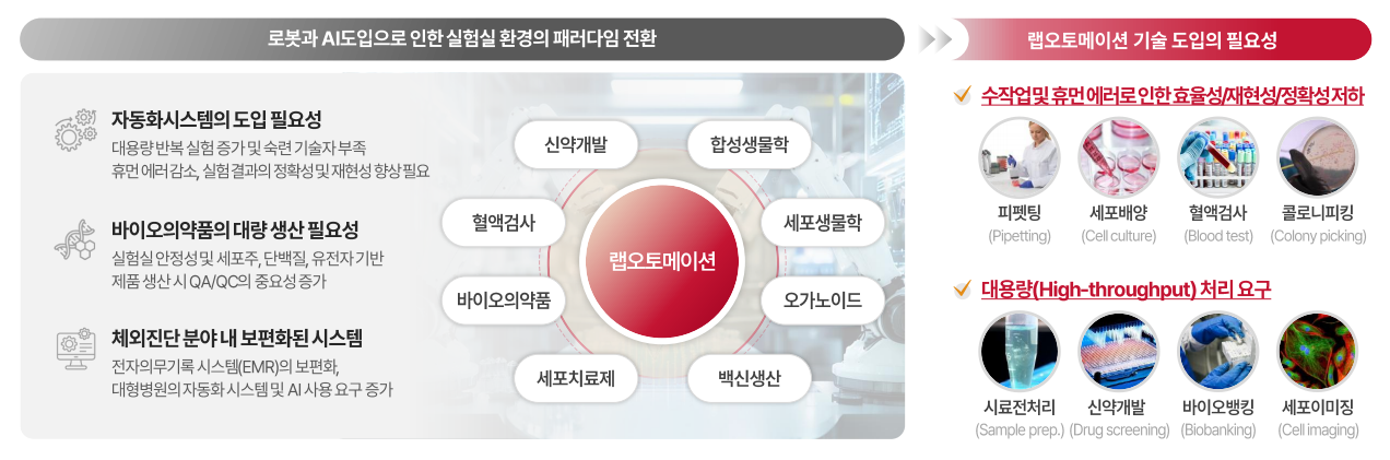- 바이오의약품, 유전자 치료제, 합성생물학 등 세포 연구의 자동화 수요 급증