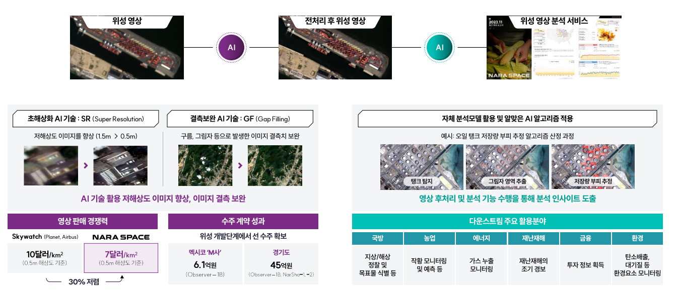 - 다운스트림(Downstream): 위성 영상 판매 및 AI 기반 영상 분석 서비스 (초해상화, 결측 보완 등).