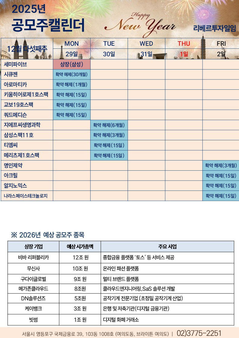 | 2026년 1월 둘째주 공모주캘린더 (0) | 2026.01.05 |