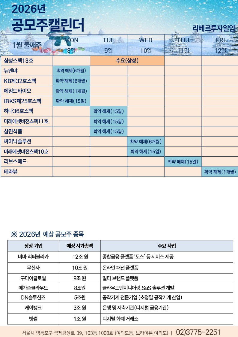 | 2026년 1월 셋째주 공모주캘린더 (1) | 2026.01.12 |
