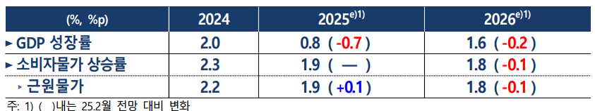 이를 전제로 올해 성장률은 2월 1.5%에서 0.8%로 하향 조정했습니다.