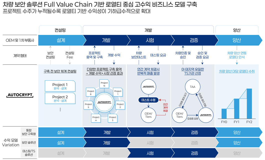 아우토크립트는 2019년 설립했으며, 서울 영등포구에 소재하고 있습니다. 주 사업분야는 자동차 보안 토탈 솔루션입니다. 소프트웨어 중심의 미래차 시대가 도래 함에 따라 보안 솔루션을 통한 리스크 대응이 필요한데 크게 차량 내부 보안과 차량 외부 통신 보안을 들 수 있습니다. 당사는 업계 유일 포트폴리오별 Full Value Chain을 구축하였고 글로벌 고객 파이프라인 역시 확보하였습니다.