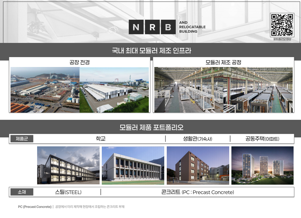 엔알비는 2019년 10월에 설립 했으며, 본사는 전라북도 군사시에 소재하고 있습니다. 주 사업분야는 모듈러 설계, 건축업, 모듈러 임대, 판매업입니다. 국내 최대 모듈러 제조 인프라를 구축하고 있으며 다양한 모듈러 제품 포트폴리오를 가지고 있습니다.