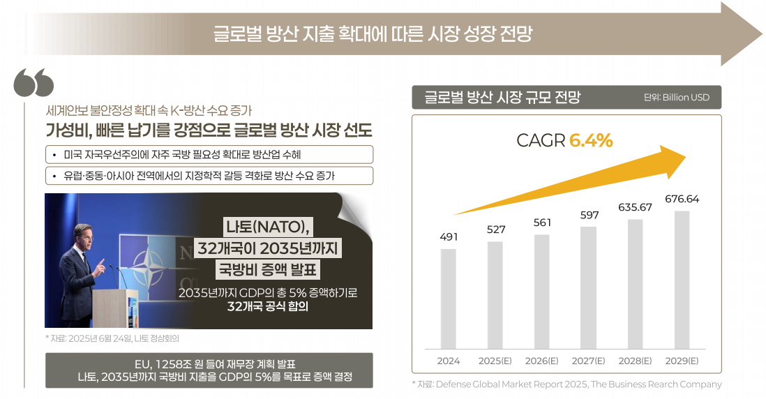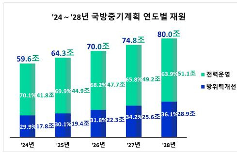 또한 유럽의 재무장과 글로벌 국방비 지출 확대에 따라 글로벌 방산 시장 규모는 확대될 전망으로 당사에는 호재로 보입니다. 또한 2023년 12월에 국방부에서 발표한 국방 중기계획 연도별 재원을 보더라도 연평균 7% 수준의 증가율을 보이고 있습니다.