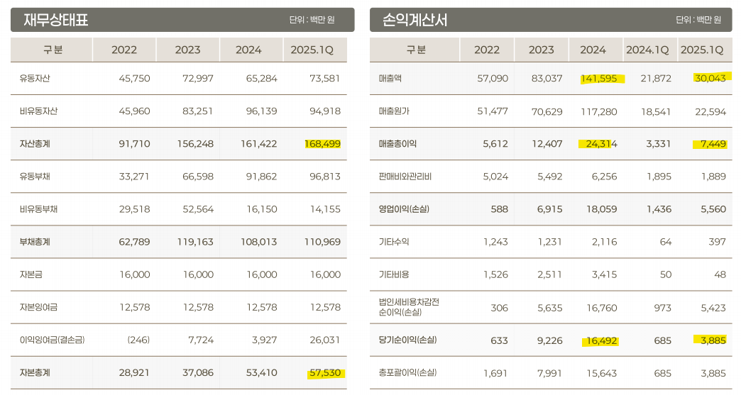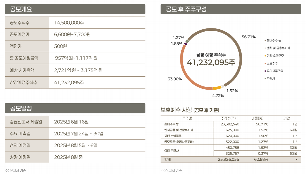 공모예정가는 6,600원~7,700원으로 예상 시가총액은 2,721억원~3,175억원으로 수요예측은 무난하게 상단으로 확정될 것으로 보이며 그럴 경우 공모예정금액은 1,117억원입니다. 평가방법은 상대가치법으로 평가모형은 PER입니다. 재무수치는 2024년 온기 당기순이이과 2025년 1분기 연환산 당기순이익의 평균으로 했으며, 피어그룹은 현대로템, LIG넥스원, 퍼스텍으로 멀티플은 27.16x입니다.