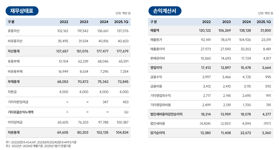 축적된 기술력을 바탕으로 높은 수익성과 안정적인 매출 구조를 확보한 당사는 2024년 기준 1,381억원의 매출을 달성하였고 올해 1분기에 318억원의 매출을 달성 사업포트 다변화와 고수익 MRO매출증가로 작년대비 더 높은 컨센을 제시하고 있습니다. 또한 IR자료에 제시하지 않은 2025년 1분기 이후 2025년 4월 가결산 매출액은 약 117억원, 영업이익은 약 8억원, 2025년 5월 가결산 매출액은 약 134억원, 영업이익은 약 11억원입니다. 2025년 6월 가결산 매출액은 약 166억원, 영업이익은 약 30억원입니다.